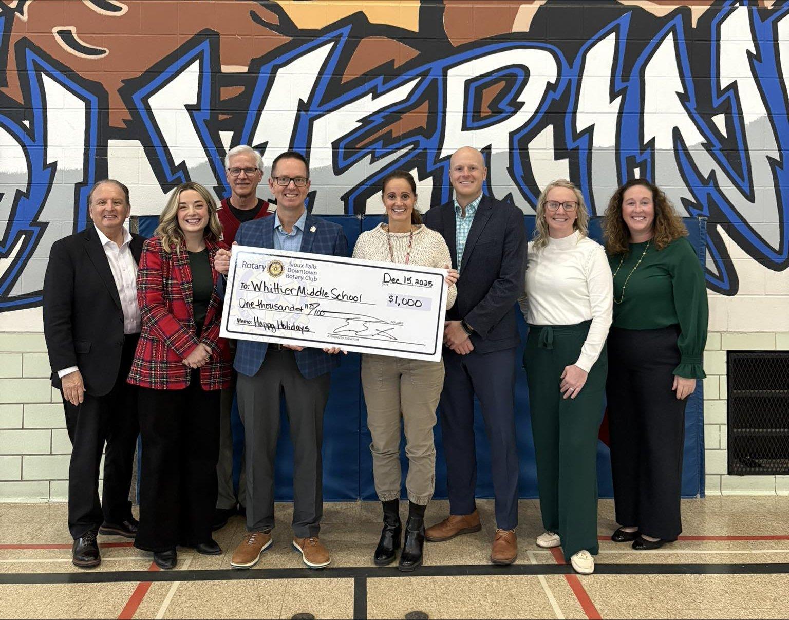 Sioux Falls Downtown Rotary was proud to deliver an early holiday gift to students at Sioux Falls Whittier Middle School, helping ensure the season is a little warmer and brighter for those in need. The club donated $1,000 to support students with essential items such as coats, gloves, and other winter necessities.