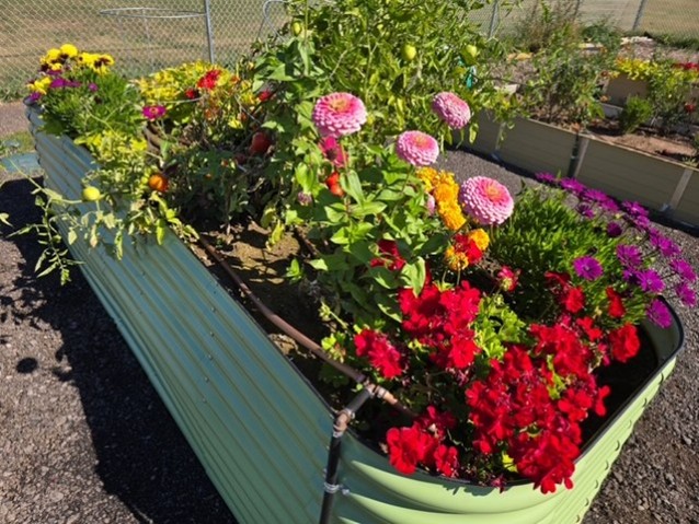 Members of the Rapid City Rotary Club took the lead in providing volunteers to build twenty raised garden beds, of which eight are wheelchair accessible. The Rotary Club then filled the beds with soil, planted flowers and vegetables, and installed a walkway around the beds. Two benches will be installed soon to provide a place for the gardeners to rest. An eight-foot fence was also installed around the beds to keep hungry deer from enjoying a free meal! Donations were provided from several local businesses including topsoil, plants, and a grant from Montana Dakota Utilities.