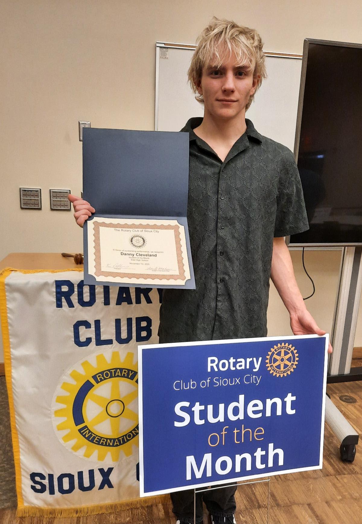 Danny Cleveland, a senior at Sioux City East High School, was selected as the November 2025 Rotary Club Student of the Month. He was honored during the Rotary Club meeting on Monday, November 10.