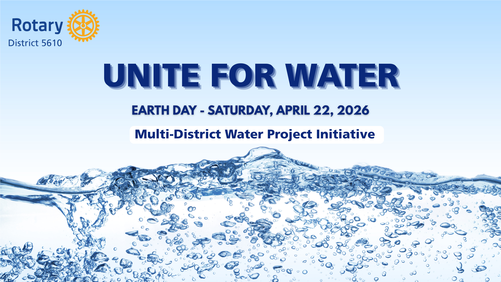 The “Multi-District Water Project Initiative” for our district is being called “Unite for Water” as a tribute to the 3-year Rotary International message “Unite for Good.” DGE Mike Gibson and DGN Jennifer Rollins are co-managing this project and will provide guidance and assistance. District Area Assistant Governors are being asked to take lead roles in helping our district meet with club leaders on the project.